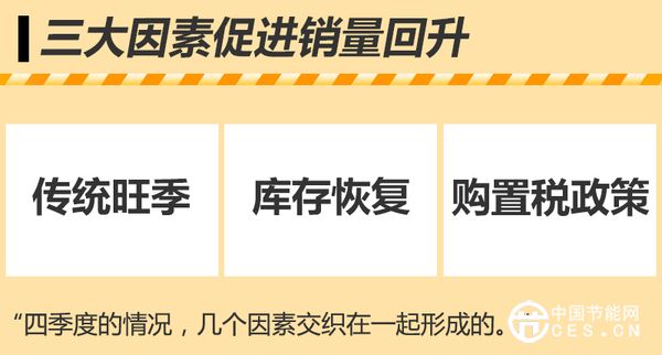 閆小雷:四季度的情況,幾個因素交織在一起形成的。第一是傳統(tǒng)旺季,到了春節(jié)前的四季度;第二是二季度經(jīng)過了庫存的高起,整個第三季度所有的廠商都在清理庫存。到了第四季度,大部分廠商庫存恢復(fù)了理想水平。第三是購置稅政策的出臺。綜合這些因素交織在一起,10月份無論批發(fā)還是零售,都表現(xiàn)出一個這樣的增速。
