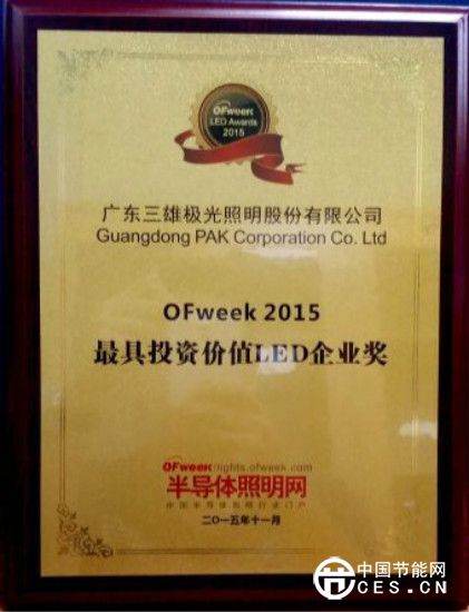 三雄極光榮獲OFweek 2015最具投資價(jià)值LED企業(yè)獎(jiǎng)