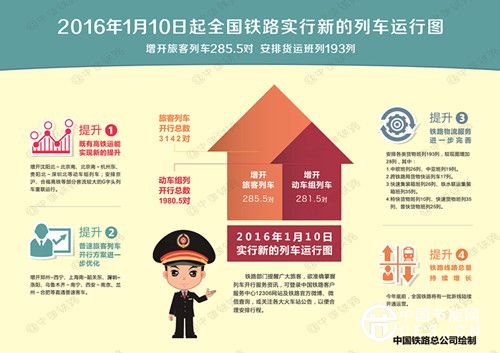 記者從中國(guó)鐵路總公司獲悉,從2016年1月10日零時(shí)起,全國(guó)鐵路將實(shí)行新的列車運(yùn)行圖,增開旅客列車285.5對(duì),其中增開動(dòng)車組列車281.5對(duì)。運(yùn)行圖調(diào)整后,全國(guó)鐵路開行旅客列車總數(shù)達(dá)到3142對(duì),其中動(dòng)車組列車1980.5對(duì)。