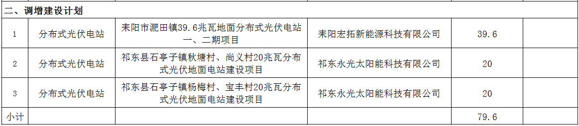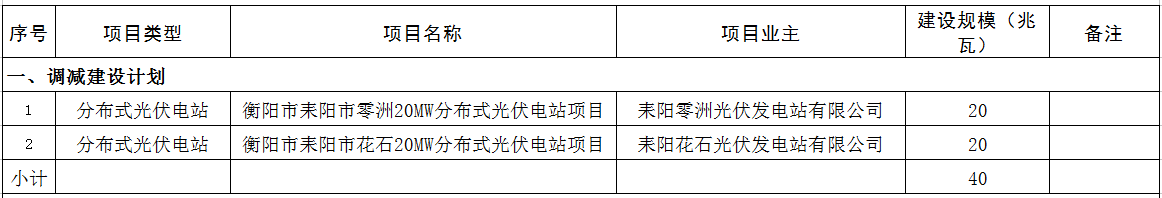 根據(jù)《湖南省發(fā)展和改革委員會(huì)關(guān)于調(diào)整2015年光伏發(fā)電建設(shè)實(shí)施方案部分項(xiàng)目和規(guī)模的通知》(湘發(fā)改能源[2015]865號(hào))要求,省發(fā)改委安排我市2015年新增集中式和分布式地面光伏發(fā)電3個(gè)項(xiàng)目裝機(jī)規(guī)模60兆瓦(我委已以衡發(fā)改能源〔2015〕10號(hào)文轉(zhuǎn)發(fā)下達(dá))。截止2015年三季度底,有耒陽市零洲20MW分布式光伏電站項(xiàng)目、衡陽市耒陽市花石20MW分布式光伏電站項(xiàng)目等2個(gè)仍未備案和開工建設(shè)的項(xiàng)目,此次共調(diào)減建設(shè)計(jì)劃40兆瓦;耒陽市淝田鎮(zhèn)39.6兆瓦地面分布式光伏電站一、二期項(xiàng)目,祁東縣石亭子鎮(zhèn)秋塘村、尚義村20兆瓦分布式光伏地面電站建設(shè)項(xiàng)目和祁東縣石亭子鎮(zhèn)楊梅村、寶豐村20兆瓦分布式光伏地面電站建設(shè)項(xiàng)目等3個(gè)沒有納入2015年實(shí)施方案且已開工的項(xiàng)目,共調(diào)增建設(shè)計(jì)劃79.6兆瓦。(詳見附表1)