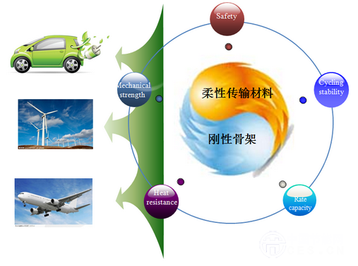 現(xiàn)有的鋰離子電池液體電解質(zhì)體系,不能滿足動力電池對高能量、高功率和安全性等多方面的要求。青島儲能產(chǎn)業(yè)技術(shù)研究院研發(fā)團(tuán)隊提出了“剛?cè)岵?jì)”的研發(fā)思路,開發(fā)出一系列新型聚合物電解質(zhì)體系,很好地解決了上述瓶頸問題,同時大幅提升了安全使用性能。“剛?cè)岵?jì)”就是使用“剛”性骨架材料,如聚酰亞胺、芳綸、聚芳砜酰胺、玻璃纖維和纖維素等(Nano Energy, 2014, 10, 277-287; Solid State Ionics, 2013, 245-246, 49-55;232, 44-48; Journal of the Electrochemical Society, 2013, 161, A1032-A1038; Progress in Polymer Science, 2015, 43, 136-164)無紡布材料,改善電池的力學(xué)性能和尺寸熱穩(wěn)定性能;利用“柔”性離子傳輸材料,如聚環(huán)氧乙烷(PEO)、聚偏氟乙烯-六氟丙烯(PVDF-HFP)、聚甲基丙烯酸甲酯(PMMA)、氰基丙烯酸酯和聚碳酸丙烯酯(PPC)等賦予優(yōu)異的離子傳導(dǎo)性和界面穩(wěn)定性,通過“并濟(jì)”即兩種或多種材料復(fù)合達(dá)到多贏的效果,實現(xiàn)綜合性能的大幅提高,進(jìn)而滿足動力電池的要求。