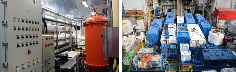 目前,這2套系統(tǒng)均已得到了良好的應(yīng)用。其中,地?zé)崴幚硐到y(tǒng)已經(jīng)在南堡35-2平臺進行了固化,并單獨設(shè)置了反滲透處理操作間(見圖 4)。地?zé)崴幚硐到y(tǒng)自2008年至今共完成了20口井次的作業(yè),每口井次提供2 000~5 000 m3的反滲透水,已累計制反滲透水64 000 m3。設(shè)備運行期間,定時對處理后的水進行取樣檢測,檢測結(jié)果均達到多元熱流體發(fā)生器的供水指標,效果良好。