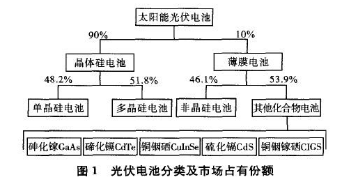 太陽(yáng)能電池按其所用原料不同可以分為晶體硅太陽(yáng)能電池、薄膜電池、染料敏化電池和有機(jī)太陽(yáng)能電池等幾類。其中染料敏化太陽(yáng)能電池和有機(jī)太陽(yáng)能電池尚處于實(shí)驗(yàn)研發(fā)階段,市場(chǎng)占有率極低。圖1顯示了歐洲光伏產(chǎn)業(yè)協(xié)會(huì)(EPIA)列舉的太陽(yáng)能光伏電池分類及市場(chǎng)占有份額。從圖1中可以看出,晶體硅電池仍是光伏產(chǎn)業(yè)的主流產(chǎn)品,市場(chǎng)占有份額約9O%。薄膜電池領(lǐng)域中,化合物薄膜電池市場(chǎng)占有份額在1/2以上,高于非晶硅薄膜電池。