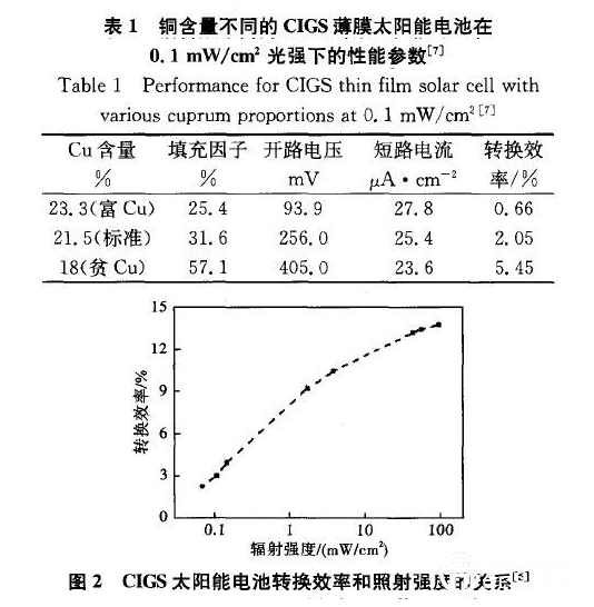 CIGS薄膜太陽(yáng)能電池不僅在陽(yáng)光直射下具有較高的轉(zhuǎn)化效率,其弱光特性也是其他電池所無(wú)法比擬的。研究表明,在太陽(yáng)輻射強(qiáng)度不太理想的地區(qū),CIGS薄膜電池一天或一段時(shí)間內(nèi)的累計(jì)發(fā)電量要遠(yuǎn)高于其他類電池。圖2為照射光輻射強(qiáng)度對(duì)玻璃襯底CIGS薄膜電池轉(zhuǎn)換效率的影響。標(biāo)準(zhǔn)光強(qiáng)照射條件下光電轉(zhuǎn)換效率為14%左右,光強(qiáng)降到5mW/cm時(shí),仍有1O%左右的光電轉(zhuǎn)換效率,當(dāng)光強(qiáng)進(jìn)一步降到0.1mW/cm時(shí),效率相應(yīng)降到3%左右。Virtuan等研究了銅含量不同的CIGS薄膜電池在低輻射強(qiáng)度下的性能參數(shù)情況,結(jié)果如表1所示。從表1可以看出,Cu含量的適度降低可以極大提高電池的弱光特性。貧銅含量下,電池轉(zhuǎn)換效率大約為標(biāo)準(zhǔn)銅含量時(shí)的2.6倍,填充因子和開(kāi)路電壓也有顯著提高。這表明CIGS薄膜電池的弱光性能可以通過(guò)銅含量的適度偏離得到極大改善。