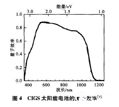 通過(guò)改變CIGS吸收層中Ga的含量,可以實(shí)現(xiàn)產(chǎn)物禁帶寬度在1.O4~1.68eV之間的可控性調(diào)節(jié)。鑒于吸收太陽(yáng)能理想的禁帶寬度為1.45~1.5eV,通過(guò)帶隙優(yōu)化可使CIGS最大限度地吸收太陽(yáng)能。圖4顯示了高質(zhì)量CIGS太陽(yáng)能電池量子效率圖。量子效率是指針對(duì)某一波長(zhǎng)的入射光收集到的光電流與照射到薄膜表面的該波長(zhǎng)的光子數(shù)之比。明顯地,量子效率越高,光電轉(zhuǎn)換效率越大。從圖4中可以看出,CIGS薄膜電池的光譜響應(yīng)范圍較寬(350~1100rim),約占太陽(yáng)能輻射光譜能量的79%,光譜利用率高。