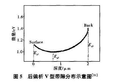 另外,在沉積CIGS吸收層時(shí)可制成具有Ga含量偏析的層狀結(jié)構(gòu),使禁帶寬度呈梯度或V型分布。圖5顯示了后偏析V型帶隙分布示意圖。如圖5所示,薄膜內(nèi)部存在帶隙極小點(diǎn)(1.0~1.1eV),兩側(cè)帶隙較寬。這樣高能量光子在寬帶隙薄膜表面處被吸收,能量較小的紅外光子透過(guò)薄膜表面后在帶隙極小處被吸收,從而最大限度地提高光子的吸收效率。另外,后偏析V型帶隙分布由于在靠近Mo背電極附近的吸收層形成勢(shì)壘,減少了光生載流子在Mo背電極的復(fù)合,從而可獲得更多的電流輸出。