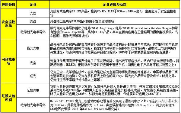 除了監(jiān)控領(lǐng)域,在感測(cè)器領(lǐng)域應(yīng)用廣泛。除了用于智能手機(jī)的近距離感應(yīng)器(Proximity Sensor)模組、穿戴式設(shè)備外,也包含前景備受看好的生物感測(cè)器(Bio-Sensor)應(yīng)用,例如偵測(cè)心跳與血氧,前者采用 IR 530 nm、660 nm、940 nm LED,后者則采用 IR 660 nm 與 940 nm LED。另外,針對(duì)需要特殊波長(zhǎng)的虹膜辨識(shí)應(yīng)用,一般為IR 810 nm LED 可對(duì)應(yīng),在競(jìng)爭(zhēng)上相當(dāng)具有優(yōu)勢(shì)。