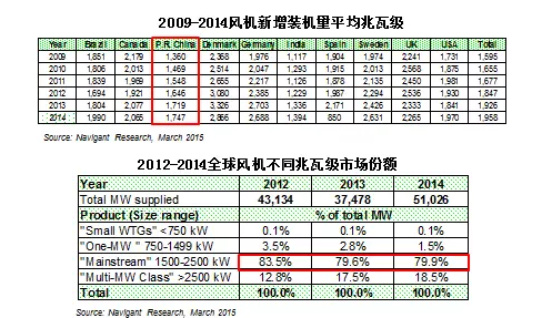 無論是國際咨詢公司Navigant research公布的全球歷年裝機(jī)情況,還是中國風(fēng)能協(xié)會(huì)公布的2014年中國裝機(jī)情況,都可以非常明顯的看到-風(fēng)力發(fā)電機(jī)的新增裝機(jī)量的平均兆瓦級(jí)是在增加的,詳情見下圖