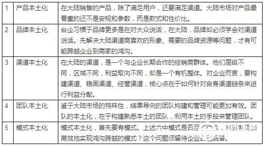在他看來,臺企進軍充滿誘惑力的大陸市場,要分一杯羹絕非易事。完成鴻溝跨域,事實上要解決五個“本土化”問題。