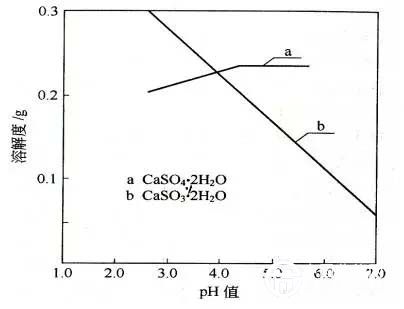 從SO2吸收反應(yīng)的機(jī)制可以看出,脫硫反應(yīng)的生成物為CaSO3,為松散的沉淀物,不穩(wěn)定,易氧化成CaSO4。CaSO4為堅(jiān)硬的沉淀物,此時(shí)脫硫產(chǎn)物是CaSO3和CaSO4的混合物。大量沉淀物的形成會(huì)造成系統(tǒng)堵塞,因此合理的pH值必須保證脫硫系統(tǒng)內(nèi)不會(huì)形成大量的沉淀物,造成系統(tǒng)堵塞。