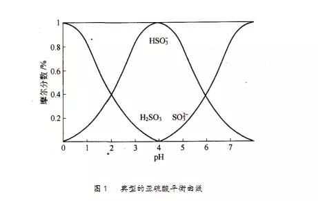 這一反應(yīng)過(guò)程是可逆的,與吸收劑漿液的pH值關(guān)系密切。漿液中H2SO3、HSO3-、SO32-隨pH值的變化曲線(xiàn)如圖1所示,在pH值為7.2時(shí),溶液中存在SO32-、HSO3-;而pH值為5以下時(shí),溶液中只存在HSO3-;當(dāng)pH值繼續(xù)下降到4.5以下時(shí),溶液中存在SO2水化合物的比例增大,與物理溶解SO2建立平衡。