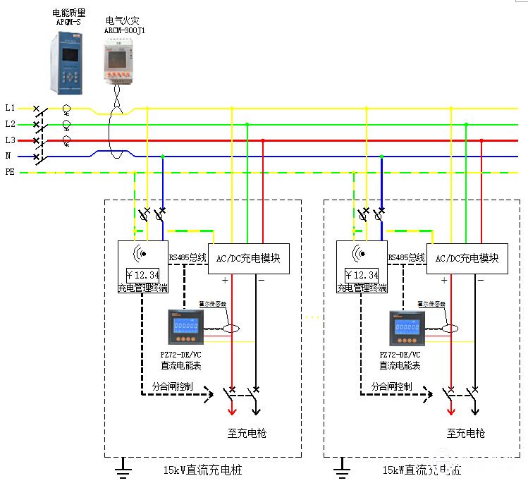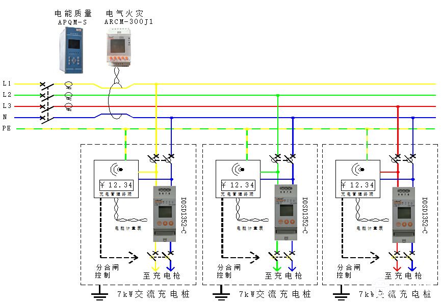 交流充電樁一般功率在7kW左右,總進(jìn)線回路配置電能質(zhì)量分析儀,對整個(gè)充電樁供電回路電能質(zhì)量進(jìn)行監(jiān)測。進(jìn)線回路同時(shí)設(shè)置電氣火災(zāi)監(jiān)控裝置,充電管理控制器,負(fù)責(zé)充電計(jì)費(fèi)控制;單相導(dǎo)軌式交流電能表,用于充電電能計(jì)量,電能數(shù)據(jù)由充電管理控制器通過RS485通訊口讀取;進(jìn)線側(cè)配置帶漏電保護(hù)斷路器;充電側(cè)配置帶電操微型斷路器等。