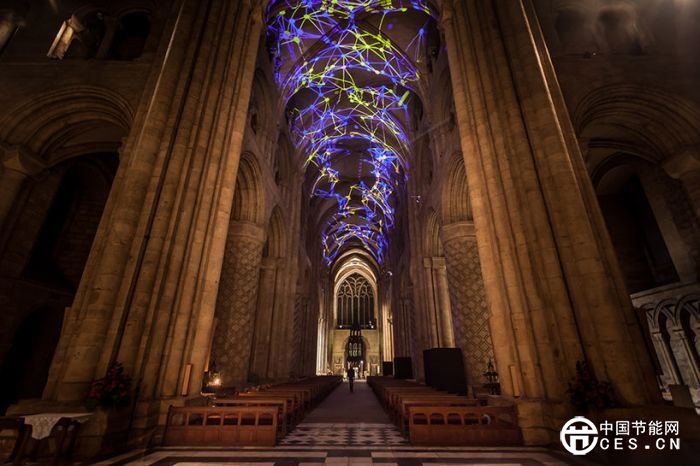 拱頂上能明顯地看到一些交叉的線條,那并不是為這個裝置所設(shè)的電線或其他設(shè)備,而恰恰是杜倫大教堂本身最具特色之處。這座大教堂使用了肋拱的交叉結(jié)構(gòu),呈“X”形狀,從而穹頂?shù)闹亓客ㄟ^這個結(jié)構(gòu)導(dǎo)向下方的大圓柱上,天花板和墻就可以更薄,相對更輕盈。這個做法在當(dāng)時是開創(chuàng)性的,也預(yù)示著教堂建筑朝更精細、纖巧的哥特式風(fēng)格靠近。