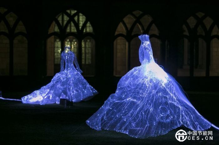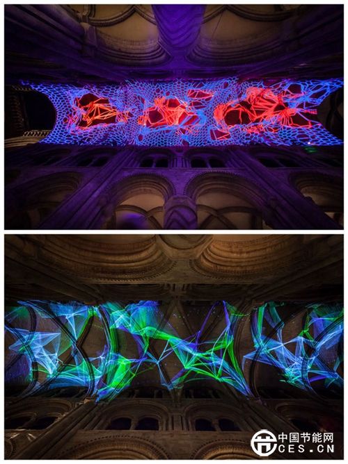 像往年一年,大教堂外壁變成了宗教畫,變幻的燈光照在上面給觀眾講述本地歷史和福音書中的故事。不過,今年教堂內(nèi)部也同樣炫麗,由法國藝術(shù)家 Miguel Chevalier 設(shè)計的巨幅燈光藝術(shù)“復(fù)雜的網(wǎng)(Complex Meshes)”出現(xiàn)在教堂穹頂上,抽象的畫面不斷扭曲、變化、移動,為這座古建筑帶來奇妙的科幻感。