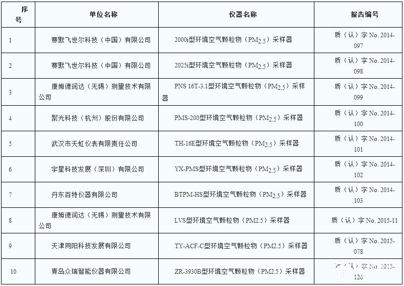 環(huán)境空氣顆粒物(PM2.5)采樣器認(rèn)證檢測(cè)合格產(chǎn)品名錄(截止2015年11月6日)