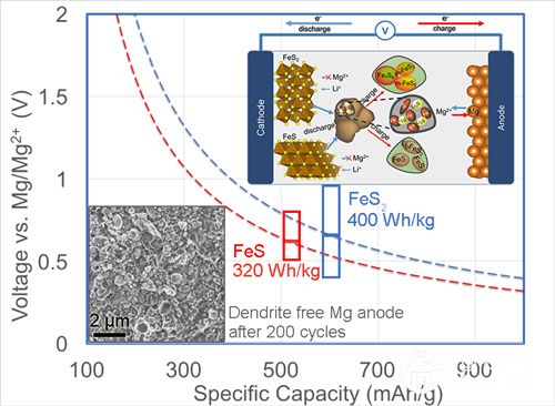 該團(tuán)隊(duì)提出一種基于轉(zhuǎn)化反應(yīng)的高能量密度的雙鹽鎂電池體系,該體系以過(guò)渡金屬硫化物為正極材料,鎂鋰雙鹽溶液為電解液,金屬鎂為負(fù)極(圖1)。其特點(diǎn)是正極電化學(xué)過(guò)程是由電解液中鋰離子驅(qū)動(dòng)的轉(zhuǎn)換反應(yīng),不僅避免了鎂離子緩慢晶格內(nèi)遷移的問(wèn)題,也實(shí)現(xiàn)了大容量的多電子轉(zhuǎn)移,同時(shí)緩和了多硫化物溶解的問(wèn)題;而負(fù)極的電化學(xué)過(guò)程由可逆的鎂沉積和剝離主導(dǎo),在長(zhǎng)期循環(huán)中也沒(méi)有枝晶形成,安全穩(wěn)定的鎂負(fù)極極大提升了電池的循環(huán)性能。該混合型鎂電池體系可將正極能量密度提升至400 Wh/kg 左右。相關(guān)研究成果發(fā)表在Adv. Funct. Mater. 2015, DOI: 10.1002/adfm.201503639。