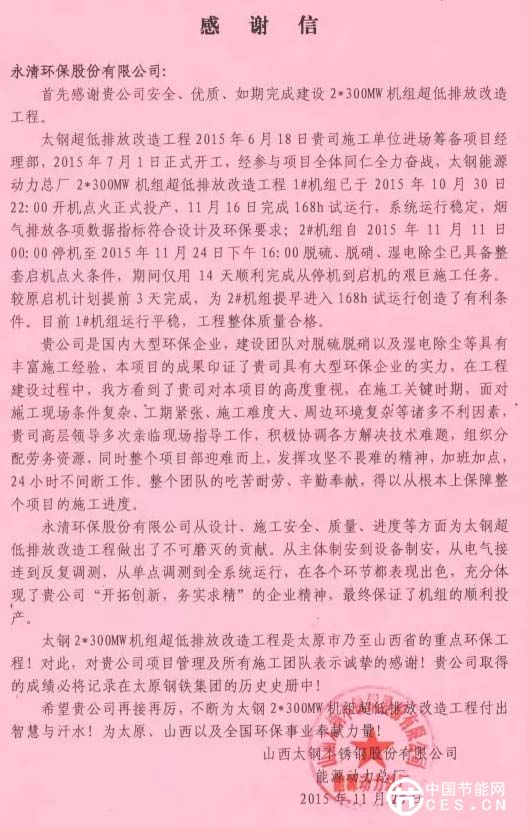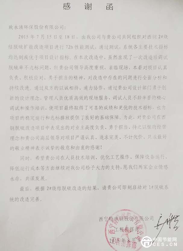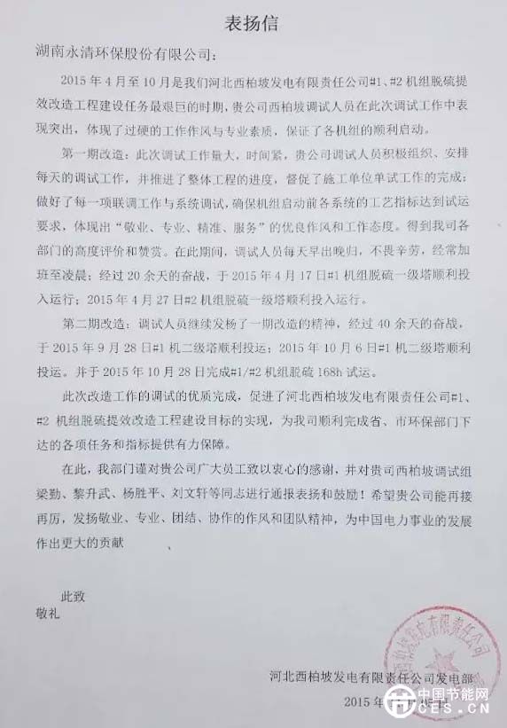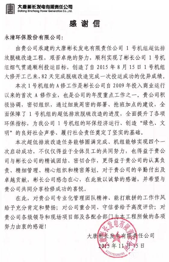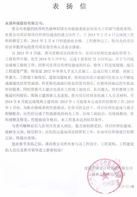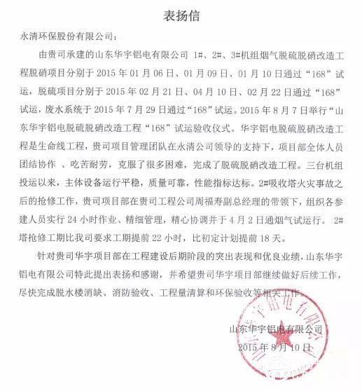 近期,在山東、在山西、在陜西、在青海,多個項目工地與業(yè)主方不約而同地發(fā)來表揚信給永清點贊,對永清人的開拓創(chuàng)新、務(wù)實勤奮、責任擔當、重約守信的精神、態(tài)度與行為給予鼓勵。這些項目有脫硫改造、超低排放、脫硝改造等,詳情如下:
