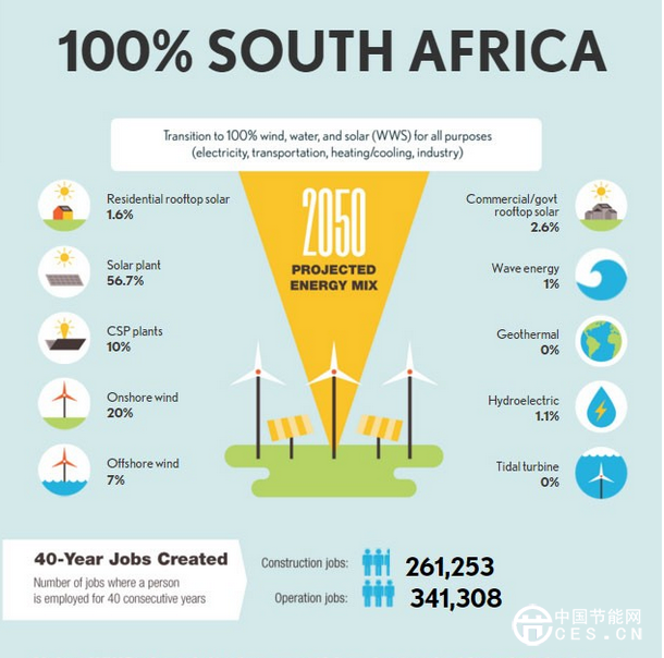 上面這張圖表展現(xiàn)了非洲要實(shí)現(xiàn)100%可再生能源供能,各種能源供能方式的比例分配,其中,光熱發(fā)電將占10%的供能比例,規(guī)?;夥l(fā)電站的供電比例為56.7%。