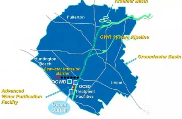 將回用水間接用于飲用水的一個(gè)典型案例是美國(guó)奧蘭治縣水務(wù)處(Orange County Water District,OCWD)。根據(jù)加州議會(huì)法案,奧蘭治縣水務(wù)處1933年建立,旨在管理和保護(hù)奧蘭治的地下水流域。現(xiàn)在服務(wù)當(dāng)?shù)?30萬(wàn)人口。當(dāng)?shù)氐叵滤a(bǔ)給主要來(lái)自附近的Santa Ana River河,科多拉多河等河流也是重要的引水來(lái)源。從項(xiàng)目開(kāi)展以來(lái),奧蘭治的地下水的流量增加了兩倍多。圖1顯示了該區(qū)域的總體情況。