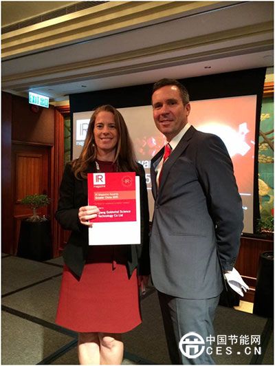 金風(fēng)科技投資者關(guān)系經(jīng)理藍(lán)凱琳在頒獎(jiǎng)現(xiàn)場(chǎng)與IR Magzine主編Neil Stewart合影