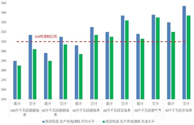 業(yè)內(nèi)能耗平均水平只有60萬(wàn)千瓦級(jí)超臨界以上濕冷機(jī)組能夠低于310克煤耗紅線,即使是先進(jìn)水平,也只有60萬(wàn)千瓦級(jí)以上超超臨界機(jī)組和60萬(wàn)千瓦級(jí)超臨界濕冷機(jī)組能夠低于310克煤耗紅線。