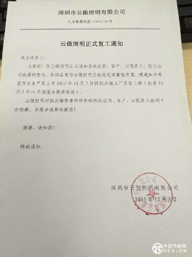 現(xiàn)云傲照明正式通知各供應(yīng)商、客戶、云傲員工;經(jīng)過公司高層的那里,各供應(yīng)商與云傲照明已擬定達(dá)成重組方案?,F(xiàn)通知并希望所有生產(chǎn)員工于2015年12月7日回到云傲工廠正常上班(此前12月1日-6日按基本薪資發(fā)放)。