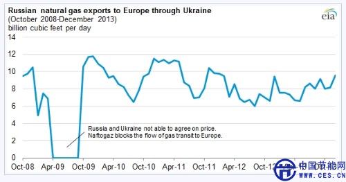 以下美國能源情報署(EIA)今年3月的圖表展示了2008年10月至2013年12月俄羅斯每日經(jīng)烏克蘭出口歐洲的天然氣規(guī)模,單位為每日10億立方英尺。