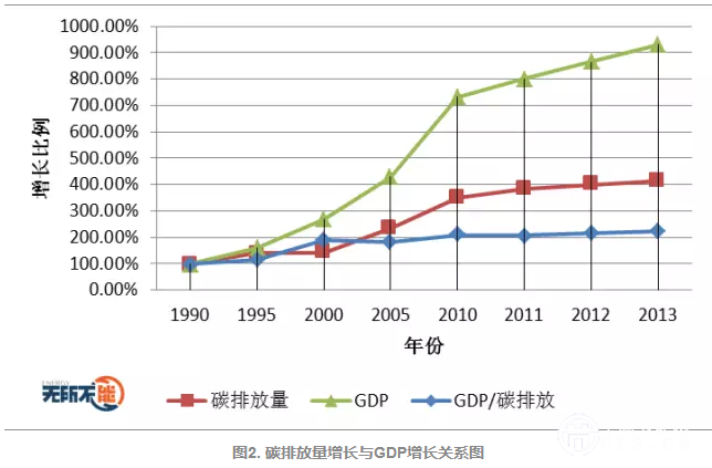 在未來5到15年內(nèi),中國經(jīng)濟(jì)將處于新常態(tài),經(jīng)濟(jì)增長速度雖然告別了過去快速增長,但是經(jīng)濟(jì)增長仍將處于6%左右,而碳排放總量的增長速度根據(jù)中國在國際上承諾的目標(biāo)可能被要求降至0,甚至負(fù)值。這在過去25年中是不可以想象的。如圖2所示,經(jīng)濟(jì)增長速率(實(shí)際GDP)雖然明顯高于碳排放量增長速率,但是目前為止,還是沒有出現(xiàn)經(jīng)濟(jì)增長而碳排放量不增長的拐點(diǎn)。說明經(jīng)濟(jì)發(fā)展依然依靠化石能源消耗的增長;能源密集型企業(yè)的碳排放量仍然在增加。