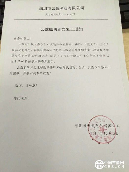 現云傲照明正式通知各供應商、客戶、云傲員工;經過公司高層的那里,各供應商與云傲照明已擬定達成重組方案。現通知并希望所有生產員工于2015年12月7日回到云傲工廠正常上班(此前12月1日-6日按基本薪資發(fā)放)。