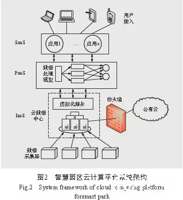 平臺大量傳感器及數(shù)據(jù)采集終端為云計(jì)算處理及決策提供原始的數(shù)據(jù)信息,包括溫度、濕度等天氣信息。對于傳感器不能獲取的信息,可能需要借助遙感衛(wèi)星。就云計(jì)算平臺的服務(wù)對象和建設(shè)地點(diǎn)而言,智慧園區(qū)云計(jì)算平臺屬于私有云的范疇。智慧園區(qū)云計(jì)算平臺系統(tǒng)架構(gòu)見圖2。