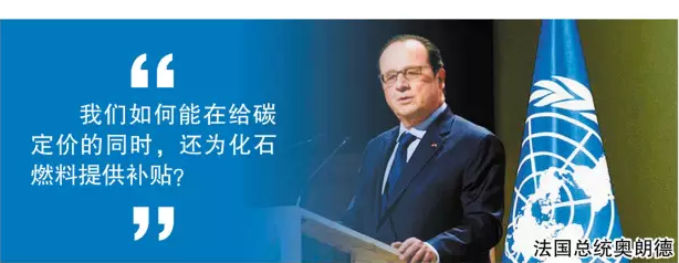 巴黎氣候大會(huì)第一天以40個(gè)國(guó)家為化石燃料補(bǔ)貼爭(zhēng)吵開(kāi)始,以6個(gè)國(guó)家、世界銀行、國(guó)際貨幣基金組織呼吁建立全球碳稅機(jī)制結(jié)束。法國(guó)總統(tǒng)奧朗德當(dāng)天表示:“我們?nèi)绾文茉诮o碳定價(jià)的同時(shí),還為化石燃料提供補(bǔ)貼?”