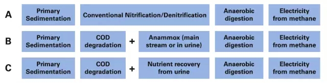 在營養(yǎng)鹽去除方面,降低能耗可以通過兩個途徑實現(xiàn):(1)營養(yǎng)鹽回收或直接利用,避免硝化過程的能耗;(2)低能耗營養(yǎng)鹽去除工藝應用,比如主流程厭氧氨氧化,和將COD去除和脫氮分開進行的工藝。