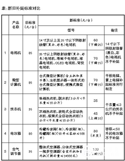 相較于2012年發(fā)布實(shí)施的補(bǔ)貼標(biāo)準(zhǔn),此次新版補(bǔ)貼標(biāo)準(zhǔn)調(diào)整主要是:電視機(jī)和電腦的補(bǔ)貼標(biāo)準(zhǔn)根據(jù)不同型號(hào)從85元/臺(tái)下降到60元/臺(tái)或70元/臺(tái);洗衣機(jī)大部分型號(hào)上調(diào)10元至45 元/臺(tái);對(duì)空調(diào)的補(bǔ)貼則由原來(lái)的35元/臺(tái)大幅上調(diào)至130元/臺(tái)。同時(shí),新版補(bǔ)貼標(biāo)準(zhǔn)明確指出,對(duì)于14寸以下陰極射線管(黑白、彩色)電視機(jī)不予補(bǔ)貼。
