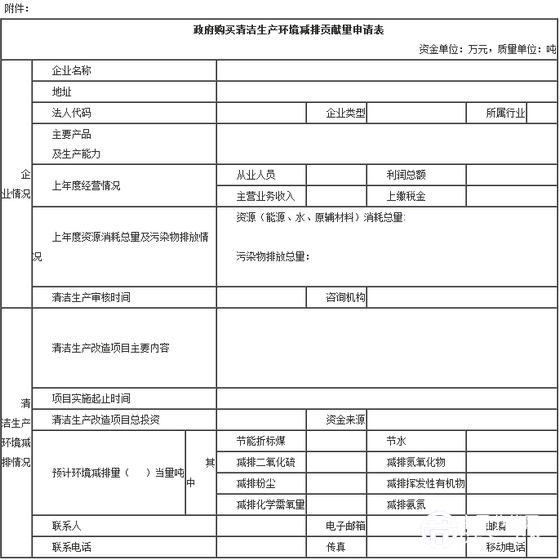 附件:政府購(gòu)買清潔生產(chǎn)環(huán)境減排貢獻(xiàn)量申請(qǐng)表