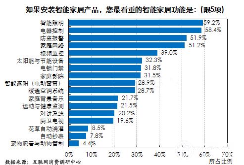 2014年一項(xiàng)互聯(lián)網(wǎng)調(diào)查顯示,智能照明超越電器控制、視頻監(jiān)控、家庭影院等智能家居功能,成為消費(fèi)者首選的智能照明。59.2%的調(diào)查人群表示智能照明是安裝智能家居產(chǎn)品是他們最看重的智能家居功能。