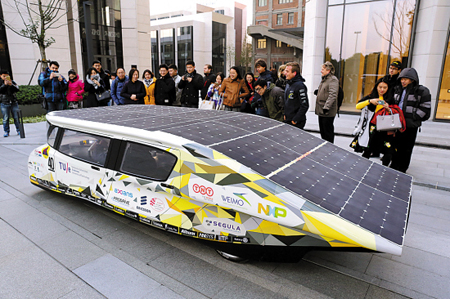 來自荷蘭埃因霍溫理工大學(xué)的學(xué)生團(tuán)隊近期在中國亮相了由他們研發(fā)的新型太陽能家用電動汽車Stella Lux,這款電動車完全由太陽能驅(qū)動。外延式車頂上布滿了太陽能電池板,由381塊單晶硅電池組合而成,總表面積達(dá)到5.84平方米,額定輸出功率可達(dá)1.4kW;此外,Stella Lux身上還搭載有一組重60kg、容量為15.2kWh的蓄電池。