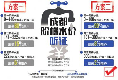 12月8日,成都市舉行中心城區(qū)居民用水階梯價(jià)格制度(以下簡(jiǎn)稱“階梯水價(jià)”)聽(tīng)證會(huì)。24位聽(tīng)證代表,1人支持第一套方案,23人支持第二套方案。方案二因?yàn)榈谝浑A梯水量較大,覆蓋人群較廣,取得壓倒性勝利。