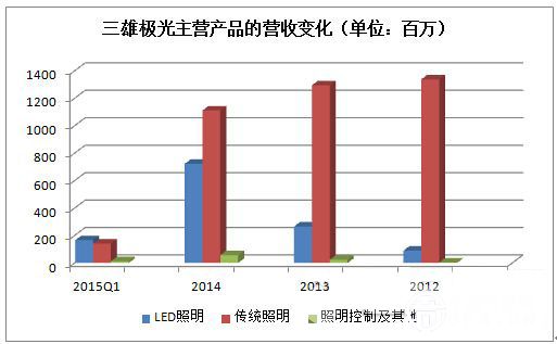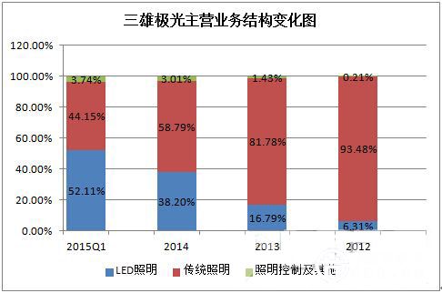 據(jù)此次招股書顯示,三雄極光2012年至2014年,公司的主營(yíng)業(yè)務(wù)收入分別為143,115.00萬元、158,267.04萬元和188,974.07萬元,復(fù)合增長(zhǎng)率為14.91%,持續(xù)增長(zhǎng)。到了2015年第一季度主營(yíng)業(yè)務(wù)就達(dá)到32109.26萬元,其中LED業(yè)務(wù)占比達(dá)52.11%,超過傳統(tǒng)照明業(yè)務(wù)。