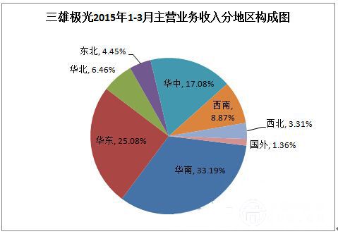 從三雄極光的2015年主營(yíng)業(yè)務(wù)分地區(qū)構(gòu)成圖來看,三雄極光主要是以內(nèi)銷為主,占住98.64%。而國(guó)外僅占1.36%。其中就國(guó)內(nèi)部分,主要分為華中、華南、華東、西南、西北、華北和東北7大區(qū)域。其中華東、華南和華東三大區(qū)域超過60%。