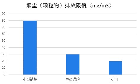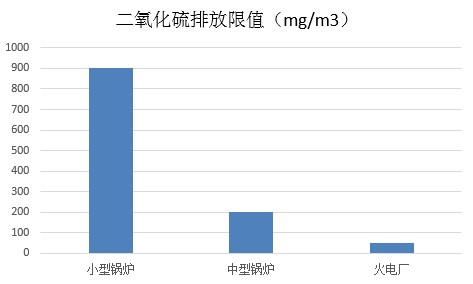 (備注:圖表中的小型鍋爐是指2001年1月1日起建成使用的10t/h以下鍋爐在一類區(qū)的污染區(qū)排放限值;圖表中的中型鍋爐是指10t/h以上鍋爐在重點(diǎn)地區(qū)的大氣污染物特別排放限值;圖表中的火電是指目前重點(diǎn)地區(qū)的火力發(fā)電廠鍋爐的大氣污染特別排放限值。此前的標(biāo)準(zhǔn)中,對于10t/h以下的鍋爐在一類區(qū)的氮氧化物的排放限值沒有限制。)