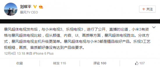 我們看看劉耀平這條微博,對小米算得上相敬如賓,可對待同樣A股兄弟的樂視倒是一點都不客氣:“暴風超體電視發(fā)布后,與小米電視3、樂視電視 3,進行了公開、直播的論道,小米3有資格與暴風超體電視比較,但從顏值、內(nèi)容、UI、畫質(zhì)等方面,暴風超體電視勝出。分體方式,暴風超體電視主機升級更 簡單。暴風超體電視與小米3都是精品級好產(chǎn)品。樂視3工藝極粗糙,畫質(zhì)、音質(zhì)都好像沒有達到產(chǎn)品級要求。”