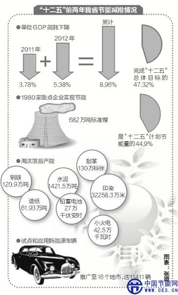 日前,記者從省經(jīng)濟(jì)和信息化委了解到,根據(jù)國家統(tǒng)計(jì)局的核定,“十二五”前兩年我省單位GDP能耗分別下降3.78%和5.38%,累計(jì)下降8.96%,超額完成7.63%的進(jìn)度目標(biāo),完成了“十二五”節(jié)能總體目標(biāo)的47.32%。