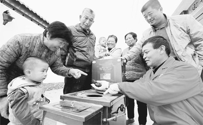 工人師傅向農(nóng)戶講解高效清潔爐具的使用方法。