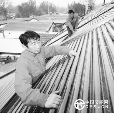 工人師傅安裝調(diào)試太陽能采暖設(shè)備。