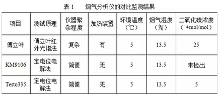在監(jiān)測煙氣中二氧化硫排放濃度時常用儀器為KM9106便攜式煙氣分析儀及Testo335煙氣分析儀,二者均采用定電位電解法,另外還有傅立葉紅外煙氣分析儀,采用紅外光譜法。燃煤電廠在安裝煙氣脫硫裝置后,脫硫效率均在90%左右,出口煙氣二氧化硫排放濃度較低,用定電位電解法分析儀在脫硫裝置出口測試時常常遇到二氧化硫檢測不出來的現(xiàn)象。在山西某電廠鍋爐煙氣脫硫裝置出口,用傅立葉紅外煙氣分析儀與KM9106、Testo335煙氣分析儀做了比對試驗,試驗結(jié)果見表1。