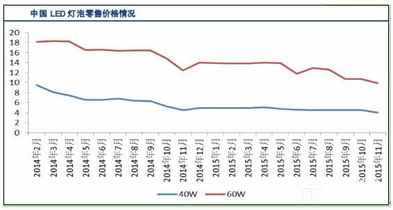 2015年11月全球取代40W的LED燈泡零售價(jià)格下降3%,至10.8美元;取代60W的LED燈泡價(jià)格下降3%,至14.6美元。其中,英國(guó)、德國(guó)地區(qū)繼10月份價(jià)格有所回調(diào)后,11月份價(jià)格均出現(xiàn)下降。