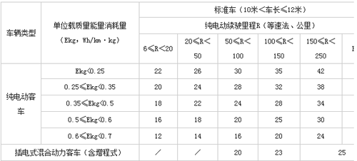 注:上述補助標準以10-12米客車為標準車給予補助,其他長度純電動客車補助標準按照上表單位載質(zhì)量能量消耗量和純電動續(xù)駛里程劃分,插電式混合動力客車(含增程式)補助標準按照上表純電動續(xù)駛里程劃分。其中, 6米及以下客車按照標準車0.2倍給予補助;6米<車長≤8米客車按照標準車0.5倍給予補助;8米<車長≤10米客車按照標準車0.8倍給予補助;12米以上、雙層客車按照標準車1.2倍給予補助。< p="">