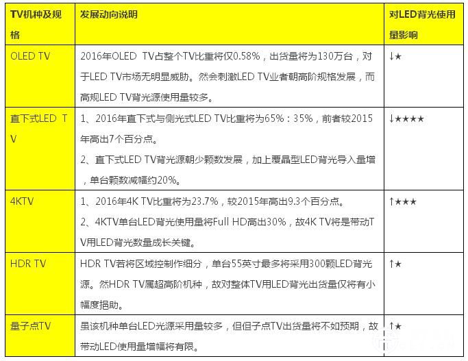 2016年各類型TV機種對于LED TV背光源使用量影響分析