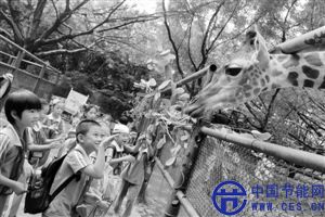周末,深圳野生動物園,中小學生與長頸鹿親密交流。