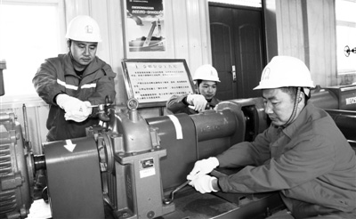 圖為職工正在對機(jī)泵進(jìn)行平衡調(diào)整。